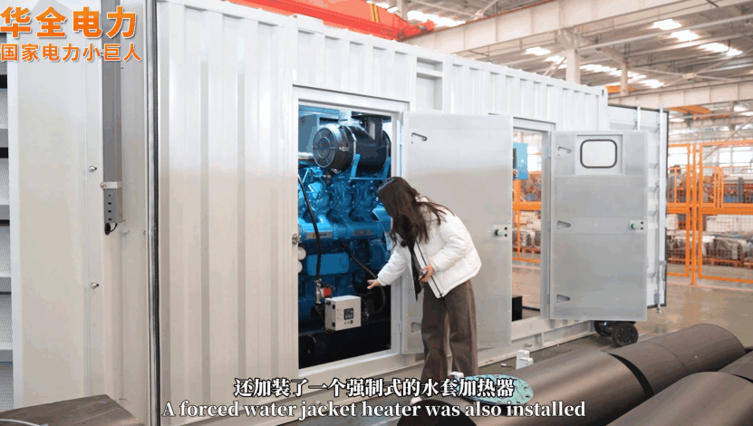 華全電力的集裝箱發(fā)電站,配備了強制型水套加熱器,在啟動前就給機組內(nèi)的柴油、機油、防凍液等加熱,快速達到負(fù)荷運轉(zhuǎn)要求。