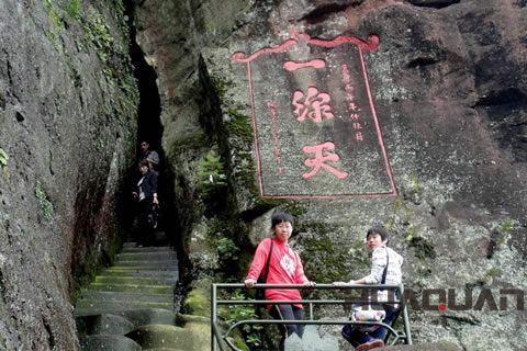其實,一線天是我國名山奇峰中常有的石景,因兩壁夾峙,縫隙所見藍天如同一線而得名。而的桃源洞一線天,絕壁出裂開一縫,直透崖端,上寬下窄,高90米,全長120米,共206個臺階。向上攀行時,兩邊巨石好似向頭頂壓來,唯見上方一線天光,那種感覺真是既奇妙又壯麗無比。明代旅行家徐霞客于崇禎三年(公元1630年)登臨此處奇觀,并記敘如下:“上辟山巔,遠透山北,中不能容肩,蓋之乃受,累級斜上,直貫其中。余所見‘一線天’數處,武夷、黃山、浮蓋,未曾見若此之大而逼、遠而整者”。
